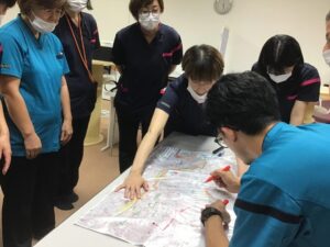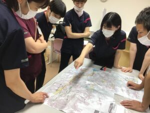 先月当ステーションでは水害時の浸水を想定して図上訓練を行いました。近隣の河川や土砂災害区域の確認をしながら、事務所から利用者様宅へどのように移動できるのか、また出先からは事務所にどう戻って来られるのかを検討しました。