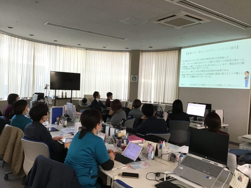 先月、当ステーションでは接遇マナーと身だしなみ、電話応対について研修を行いました。当ステーションの規定に基づき服装等の身だしなみを確認し、電話応対では受ける時・かける時のマナーについて確認を行いました。